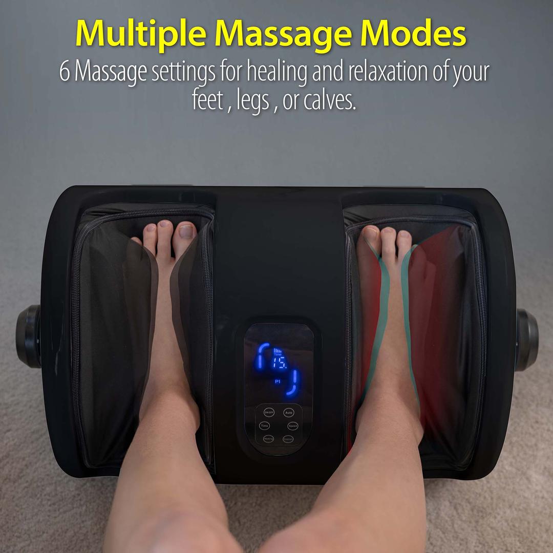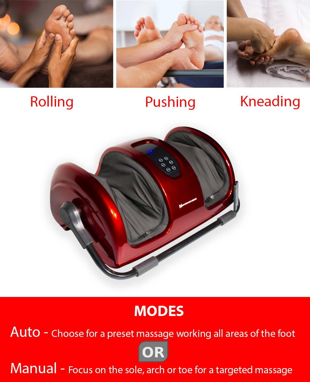 6 Massage settings for healing and relaxation of your feet, legs, or calves. Settle your feet and enjoy a deep, therapeutic massage by pressing the Auto button for 3 different modes that target the toe, arch, and sole of your feet
