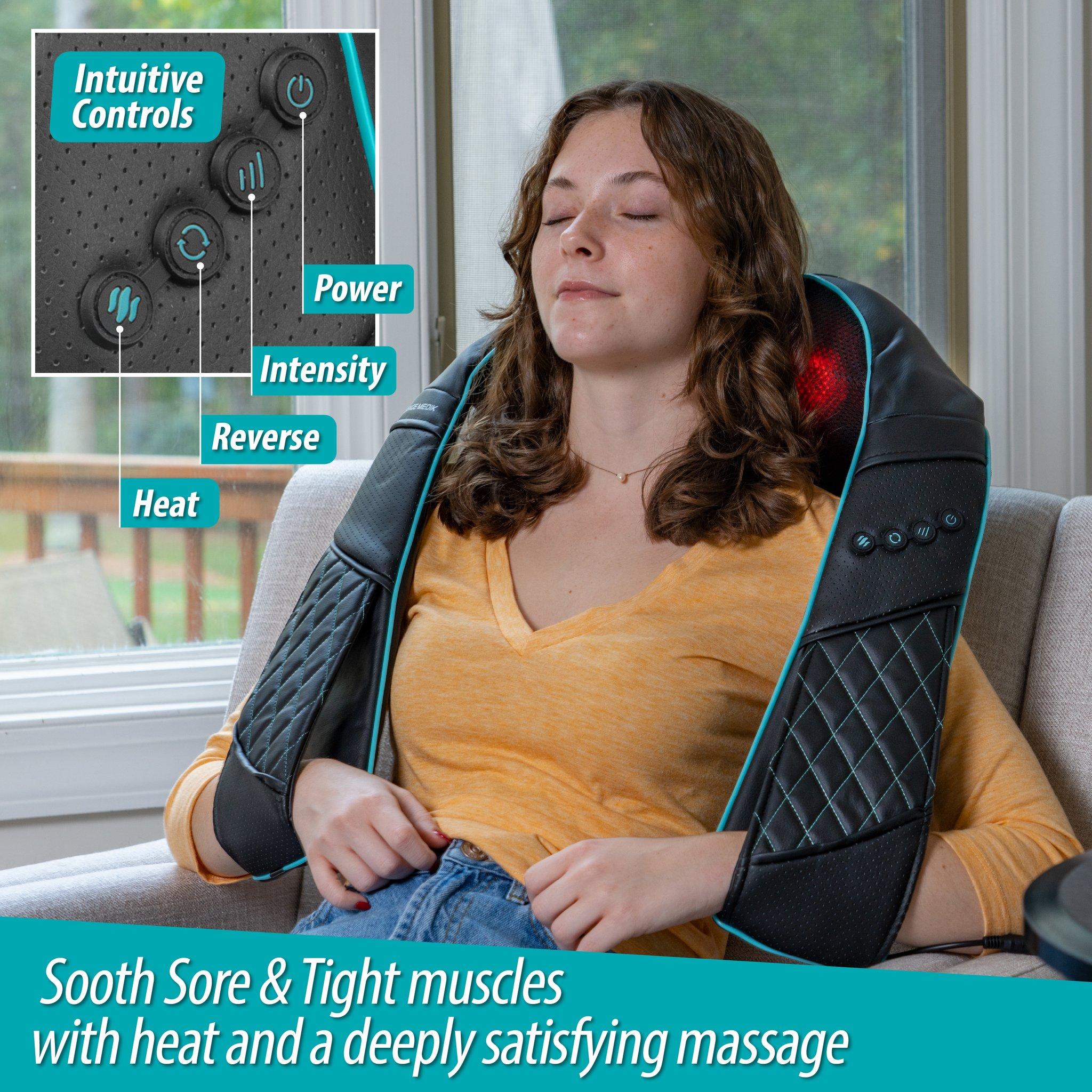 I was suffering from debilitating neck and shoulder pain for 2 months. Nothing seemed to work (exercise and meds wise) The Massage Medik neck massager did the trick. The combo of heat and deep massage reduced the pain enormously. The heat takes a good while to get up to temp but really helps take the knots out. I find the straps a bit short (I'm over 6') but workable. I find some positions where the rollers come together so hard (the way I like it) that they sound a bit like they are going to stop, but they do not. Hope that won't prematurely wear out the gears but to date (3 months) it is working perfectly. Hopefully I won't need it, but looks like it is very versatile and useful on other body parts (ie arms, legs, etc...). Worth every penny!